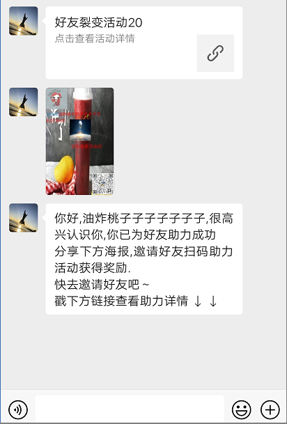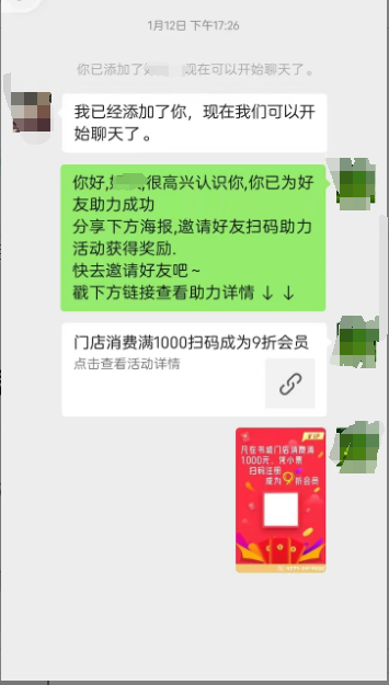 好友添加企业成员,成功助力,发送成功活动链接、助力文案、生成海报