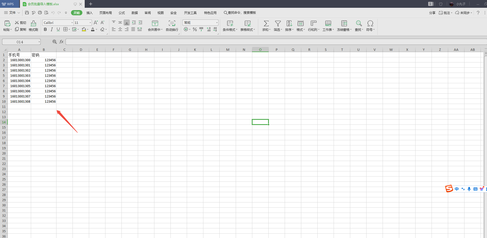 3、第三步,打开下载到桌面的会员批量导入模板,填写手机号(自定义),密码(自定义)