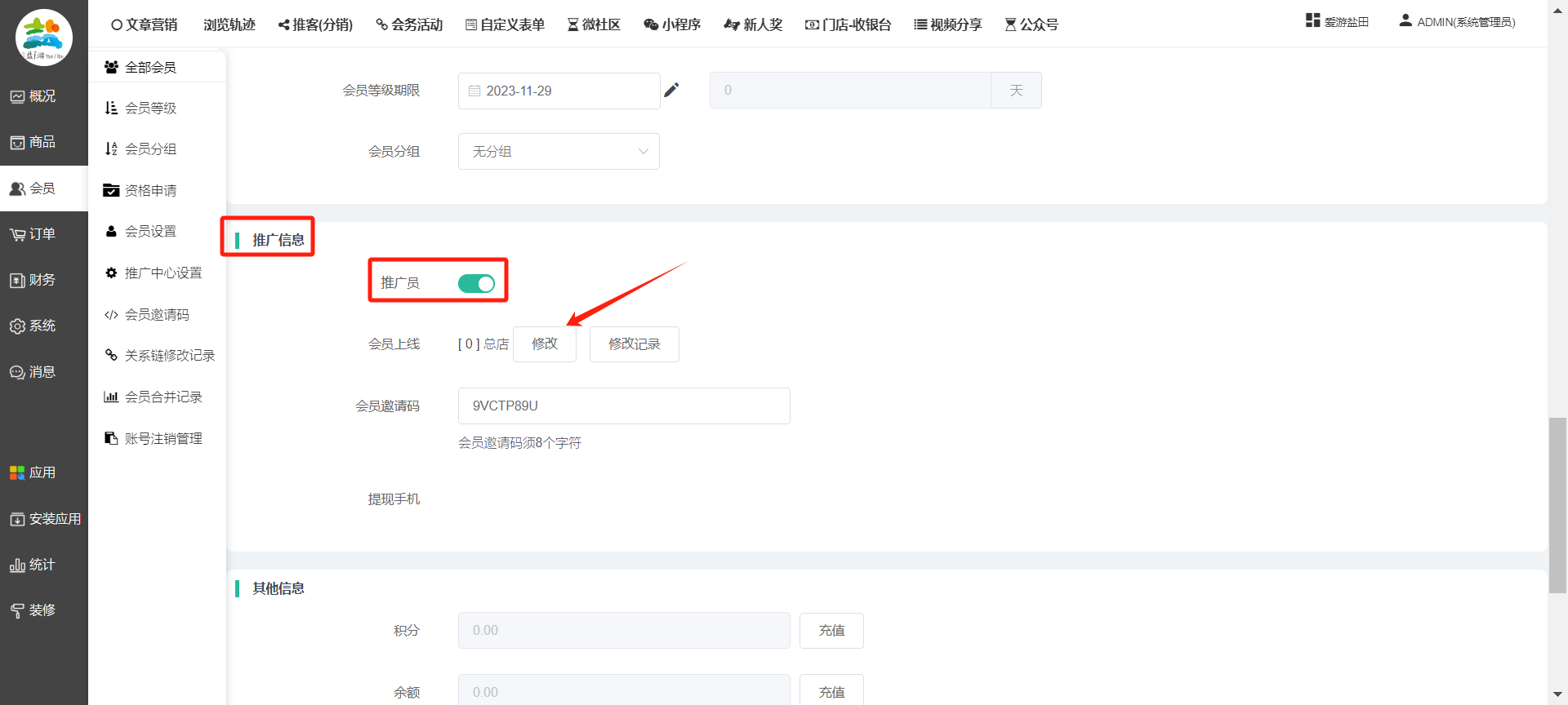 目录 搜索 展开 一、前期准备资料二、数字乡村码-上线操作指南1、服务号的申请流程及认证2、申请小程序流程3、开放平台绑定小程序和公众号三、数字乡村码-系统操作数字乡村码系统管理-概况数字乡村码-商品管理1、发布商品2、商品列表3、商品表单4、商品分类5、品牌管理6、配送模板7、评论管理8、优惠券管理9、商品标签10、退货地址设置11、满额优惠12、批量操作13、配送方式14、基础设置15、商品隐藏四、数字乡村码-会员管理1、全部会员2、会员等级3、会员分组4、资格申请5、会员设置6、推广中心设置7、会员邀请码8、会员关系链修改关系链修改记录9、会员合并记录10、账号注销管理11、会员设置中心五、数字乡村码-订单管理1、订单管理列表2、订单处理流程3、订单状态4、订单修改价格5、订单退款退货6、多包裹发货7、批量发货订单操作步骤8、催发货订单9、物流查询六、数字乡村码-财务管理1、余额设置2、会员余额3、充值记录4、转让记录5、余额明细6、收入明细7、提现设置8、提现统计9、积分管理10、转账审核11、收益广告12、批量充值七、数字乡村码-系统管理1、商城入口2、商城设置①、商城设置②、订单设置③、物流查询④、短信⑤、联系方式⑥、分类⑦、优惠券⑧、分享⑨、幻灯片⑩、广告位⑫、地图设置3、交易设置4、微信模板消息自定义消息模板(新版)自定义消息模板(旧版)小程序消息模板公众号模板消息变更公告5、语言设置6、权限管理7、多媒体管理八、数字乡村码-消息管理九、数字乡村码-应用管理十、数字乡村码系统-数据统计十一、数字乡村码-页面装修DIY1、模板管理2、店铺页面3、顶部导航4、底部导航5、DIY模板市场6、首屏广告7、基础设置8、装修DIY尺寸建议十二、供应商功能插件操作指南1、供应商2、门店-收银台门店申请和使用步骤门店管理①、门店-收银台 营销设置②、门店-收银台 分润设置门店分类门店申请门店审核门店商品门店商品订单收银台订单数据统计核销员基础设置默认设置门店装修3、微社区4、会务活动十三、营销插件操作指南活动报名提货卡新人奖微店问卷调查积分视频分享1、视频分享基础设置2、视频分享发现管理3、视频分享分类管理4、视频分享评论管理5、视频分享分红记录6、视频分享短视频中心每日红包幸运大抽奖签到优惠券二维码任务奖励优惠劵文章音频文章付费文章限时购新海报拓客卡操作流程积分活动素材中心视频红包十四、入驻门店应用类1、门店预约2、附近商品3、门店定位设置4、门店控制5、门店满额包邮6、门店满额减7、导入商品8、门店搜索9、门店股东10、核销券11、多门店核销1、商城后台设置2、前端功能演示十五、常见问题1、后台登录密码修改流程2、会员-余额,积分,后台如何进行充值与扣除3、如何修改上下级关系4、一种万能的获取商城小程序路径的方法 暂无相关搜索结果! 阅读次数:1582 本文档使用 模王系统 发布 8、会员关系链修改 8、会员关系链修改一.如何修改上下级关系?1.会员-全部会员-可以通过搜索用户的独立ID,或者用户微信昵称,找到此会员,然后点击右边的(操作)2.再点击会员详情。3.滑到下面,有个推广信息-会员上线,点击修改4.输入上级的ID号,点击搜索,出来此上级会员后点击选择。5.滑到最下面,一定要点击提交按钮。文档更新时间: 2023-11-30 14:56 作者:链上旅行