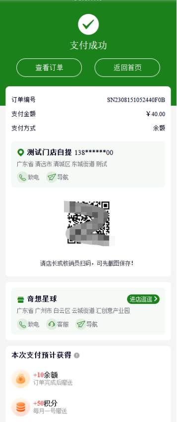 5、门店自提点订单:显示自提点信息、门店信息、若核销节点选择支付后,还会显示核销码